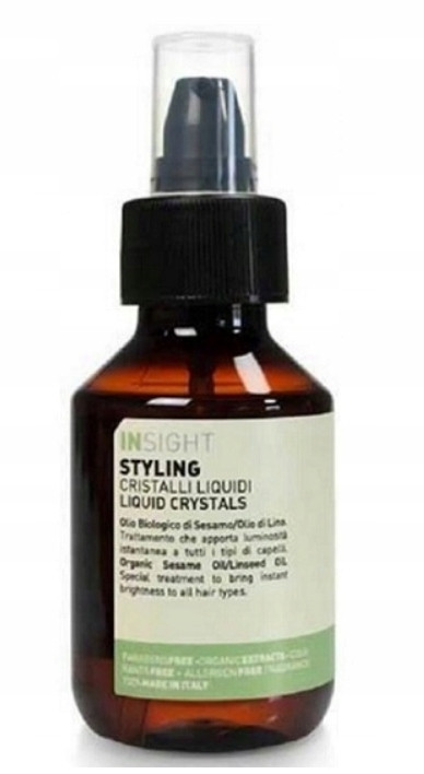 InSight Styling Liquid Crystals це сироватка для укладання волосся. Ця сироватка для укладання волосся зволожує, пом'якшує і надає еластичність пасмам, завдяки чому їх легше укладати. Крім того, він містить легкі силікони, які захищають пасма від подальшого пошкодження та завивання, викликаного вологою. Кунжутна олія та лляне масло живлять і зволожують ваші пасма, додають блиску, завдяки цим оліям ваша зачіска буде легкою та сліпучою!Порада перукаря: якщо ваше волосся потребує сильної дози зволоження, використовуйте зволожуючу сироватку щодня або навіть кілька разів на день. Сухе волосся швидко вбирає інгредієнти, що містяться в ньому, не обтяжуючи зачіску. Ємність: 100 мл• Нанесіть кілька крапель продукту на вологе або сухе волосся.• Укладайте за бажанням.